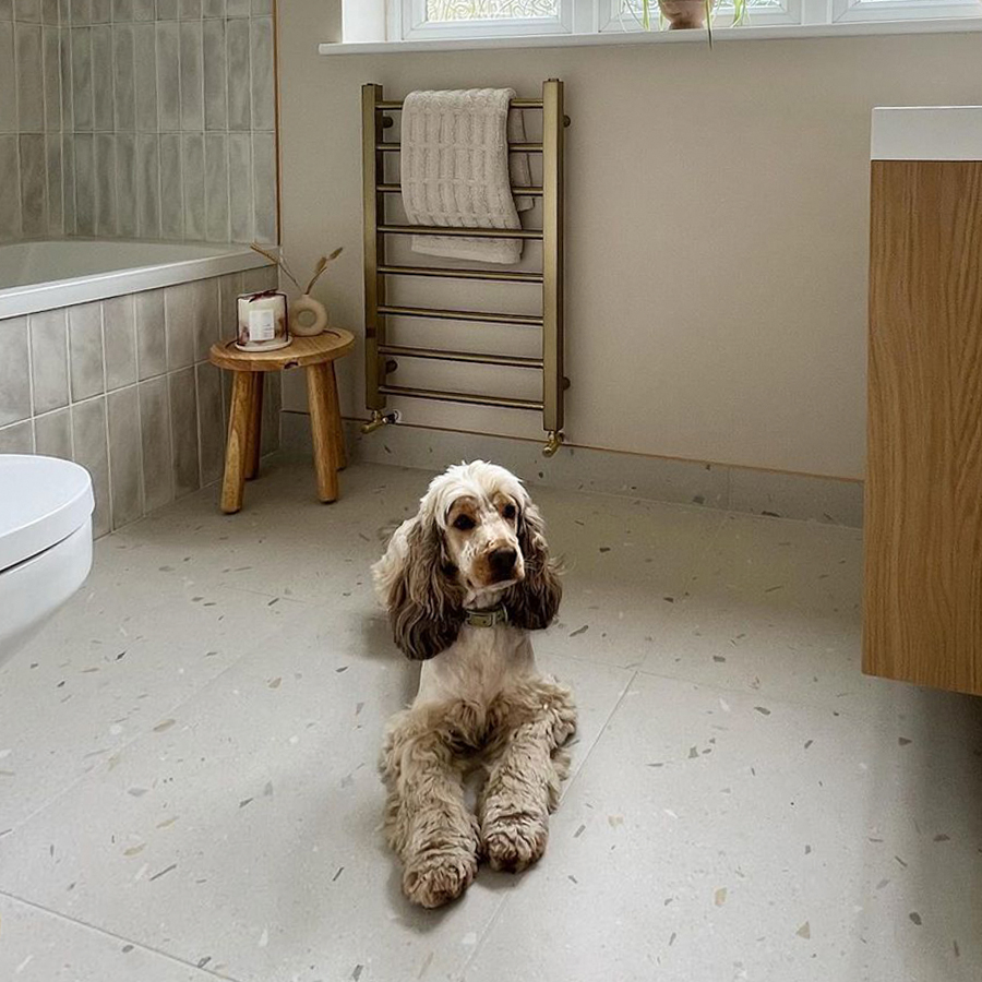 While we all want to make sure that our flooring is comfortable underfoot for our four-legged companions, at the end of the day, it’s hard to go wrong with a porcelain or stone tile floor for its durability, underfoot grip, and waterproof qualities.