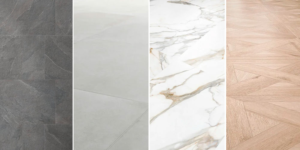 Left: Roman Grigio Stone Effect Porcelain Tiles, Right: Wentworth Cross Patterned Tiles