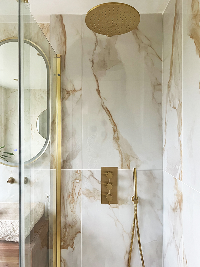 At the heart of the design are two standout tiles from our marble-effect porcelain collection. Amalfi Gold, used in the shower area, provides a rich, warm backdrop with a high-polished surface that instantly elevates the space, paired with Calacatta Amber Matte across the floors and remaining walls, an elegant marble-effect tile with delicate bronze veining. Together, the combination balances rich detail and soft veining in a way that feels elevated but never overpowering.