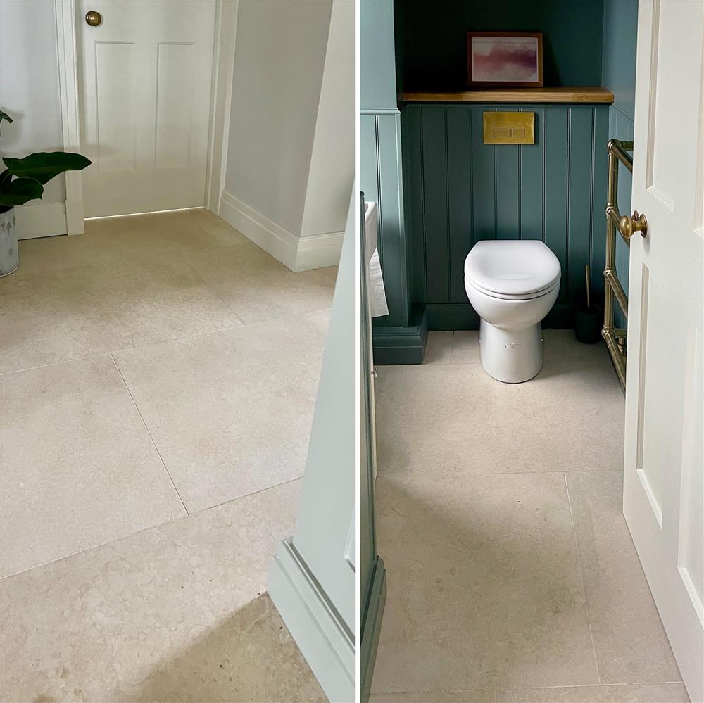 For Claudine, choosing the right flooring to complement her new kitchen’s open and light-filled design was key to achieving the perfect look. She selected our beautiful St Emilion Brushed Limestone tiles on her flooring, running through the entirety of the kitchen, utility, dining room, downstairs bathroom, and pantry. The lighter beige tone instantly lifts the colour palette while adding an undertone of subtle warmth throughout.