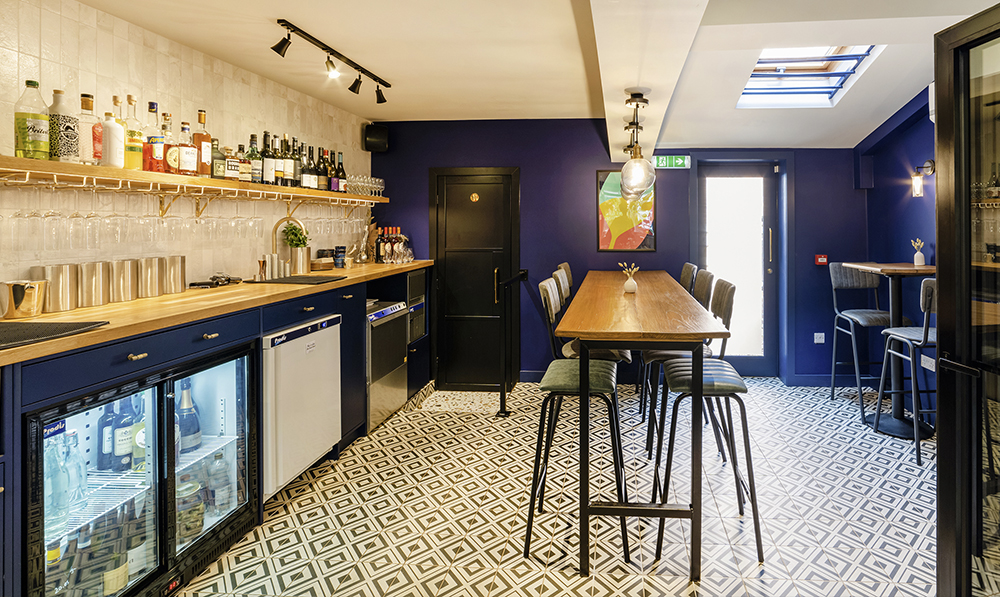 The scheme plays upon the modern influence of the tiles, using industrial-style black accents throughout to tie in the flooring, which is then softened with vibrant blue walls and warm pops of brass through the fittings and accessories.