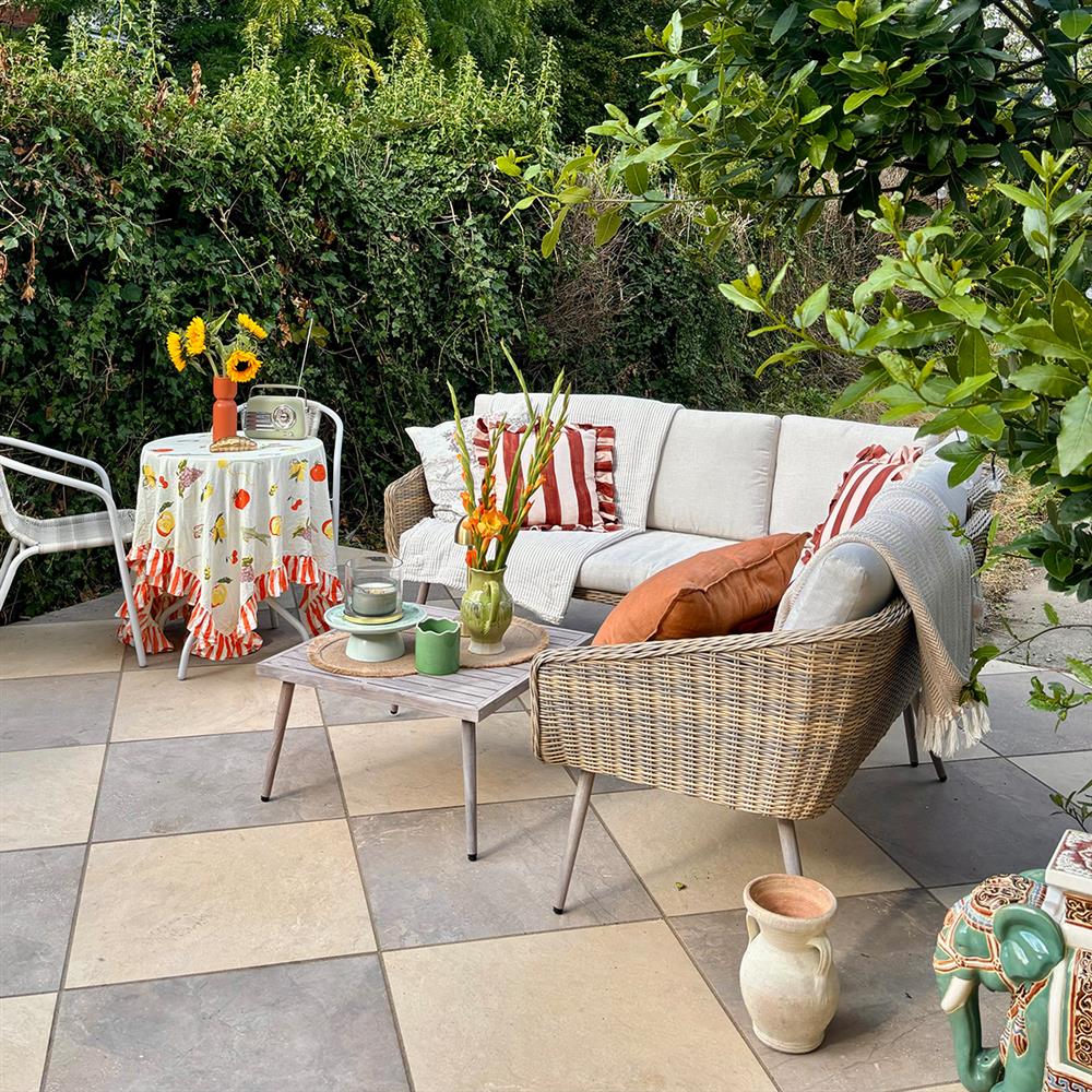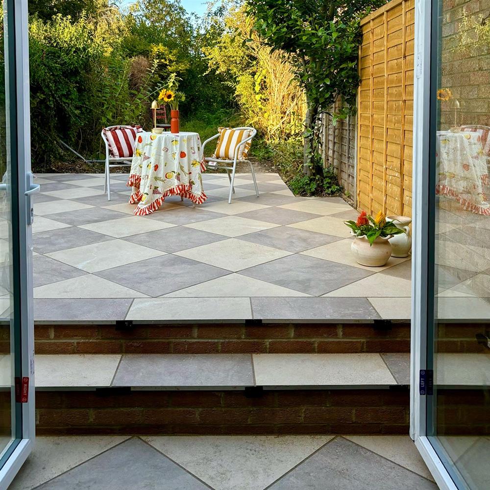 Inspired by vintage pattern and playful contrasts, Scarlett created a checkerboard-style patio using two 60x60cm square paving tiles. Laid diagonally, the pattern adds dynamic movement and character while the neutral tones keep the overall look soft and elegant. Carefully considered details highlight the stepped area of the patio in a cohesive way, balancing and breaking up the pattern while also maximising functionality through clever design choices.