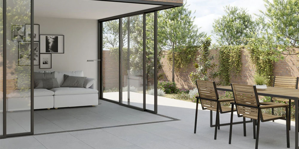 Selecting darker shades of grey paving for your patio means they can be seamlessly complemented with a set of anthracite bi-fold doorframes. These elements also contrast well with stainless steel furniture and glass tabletops, as well as planting schemes which feature bold architectural plants in metal containers.