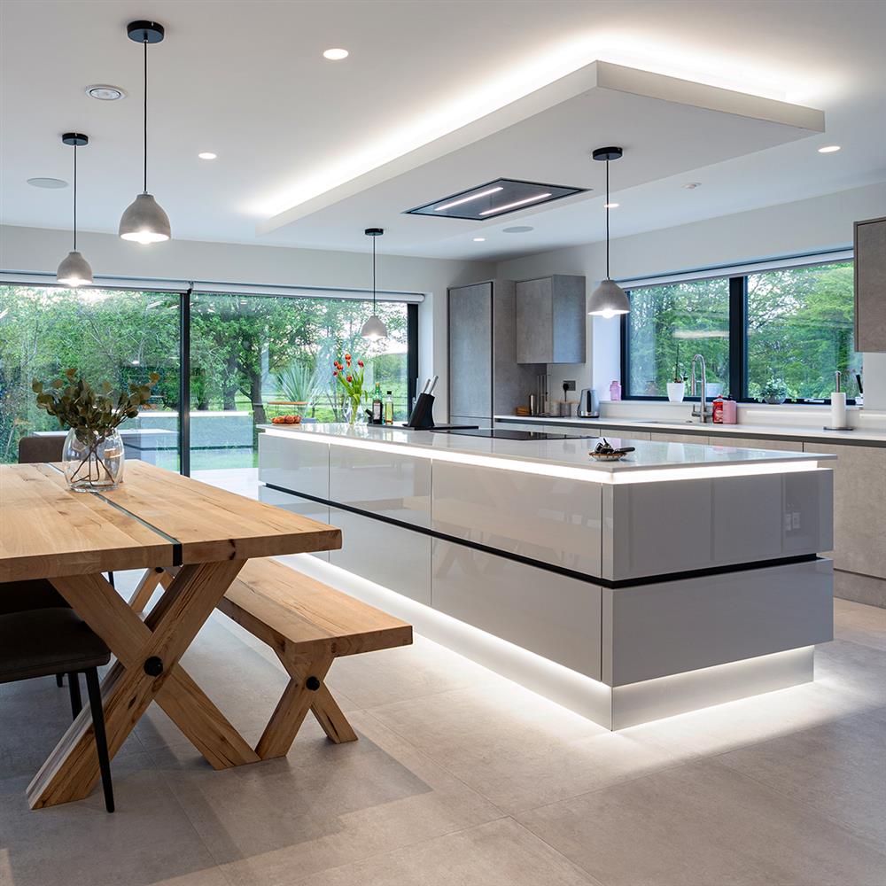 Such a choice is ideal for any kitchen space that’s large and open, drawing everything closer together without making the room feel cramped, and sits beautifully against deeper neutrals, dark woods, and rich greens.