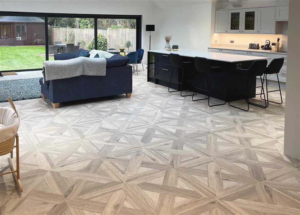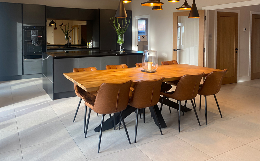 When considering flooring ideas for your kitchen, a large expanse of marble-effect porcelain tiles is a timeless and classic choice. Once buffed to a finish, it will brighten your entire kitchen, adding an elegant and enduring appeal.