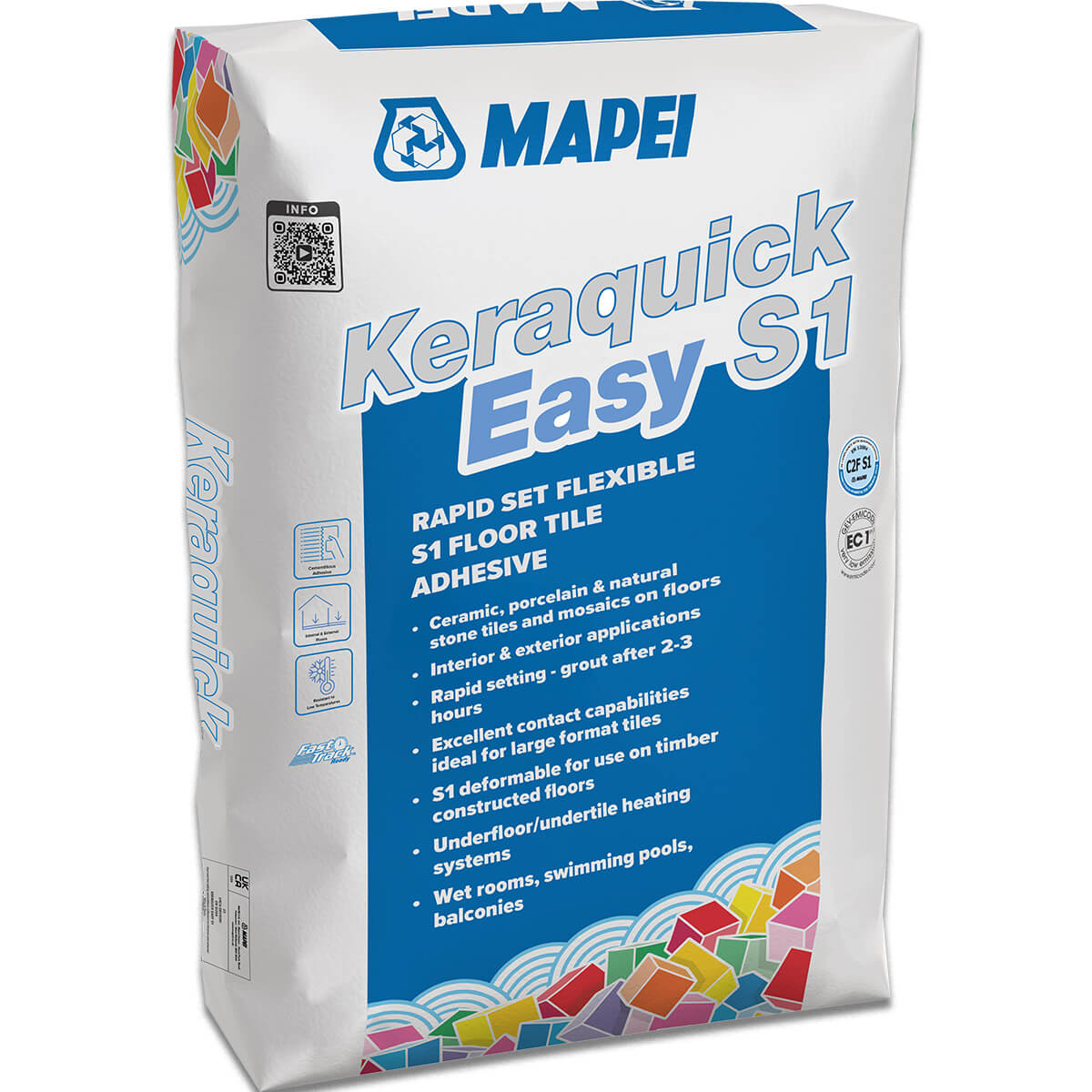 Mapei Keraquick Easy S1 is an eco-friendly cement-based rapid setting tile adhesive that gives up to 60 minutes of constant workability and accelerated adhesion, setting in 2-3 hours and ready to grout in 3 hours