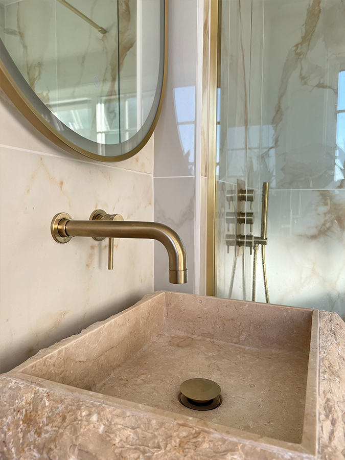 At the heart of the design are two standout tiles from our marble-effect porcelain collection. Amalfi Gold, used in the shower area, provides a rich, warm backdrop with a high-polished surface that instantly elevates the space, paired with Calacatta Amber Matte across the floors and remaining walls, an elegant marble-effect tile with delicate bronze veining. Together, the combination balances rich detail and soft veining in a way that feels elevated but never overpowering.