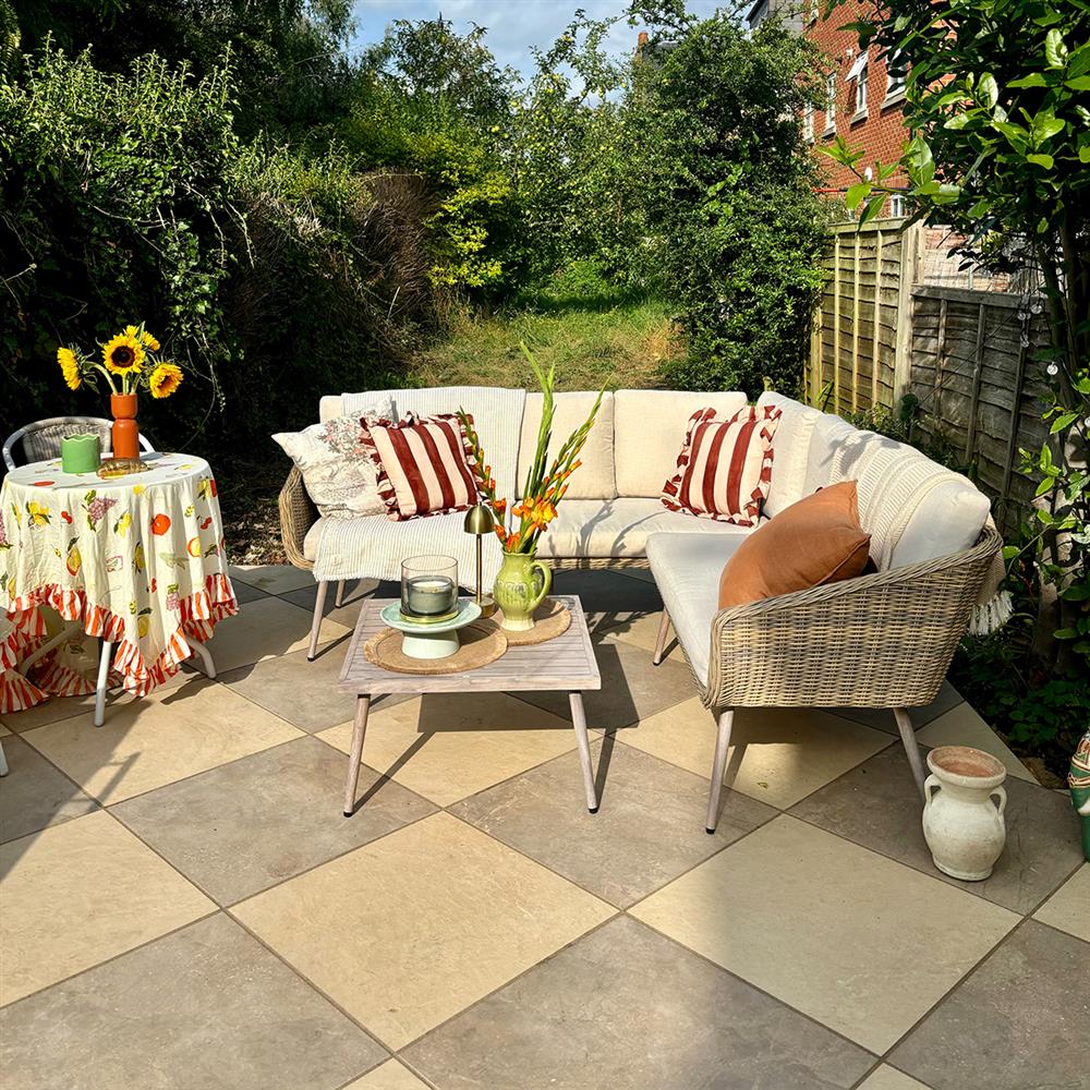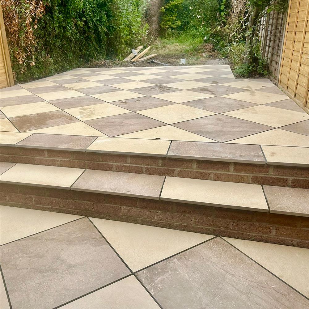 Inspired by vintage pattern and playful contrasts, Scarlett created a checkerboard-style patio using two 60x60cm square paving tiles. Laid diagonally, the pattern adds dynamic movement and character while the neutral tones keep the overall look soft and elegant. Carefully considered details highlight the stepped area of the patio in a cohesive way, balancing and breaking up the pattern while also maximising functionality through clever design choices.
