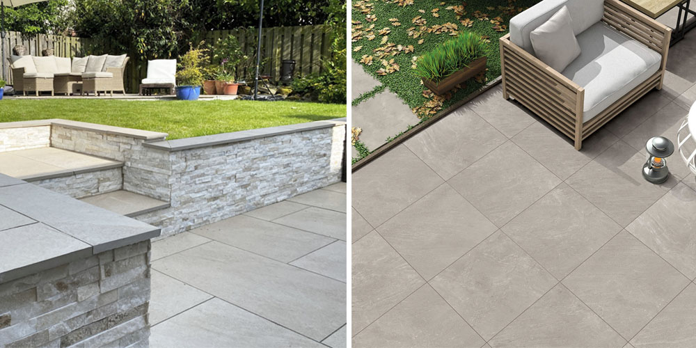 Left: Martello Beige Porcelain Paving, Right: Matterhorn Grey Porcelain Paving Slabs